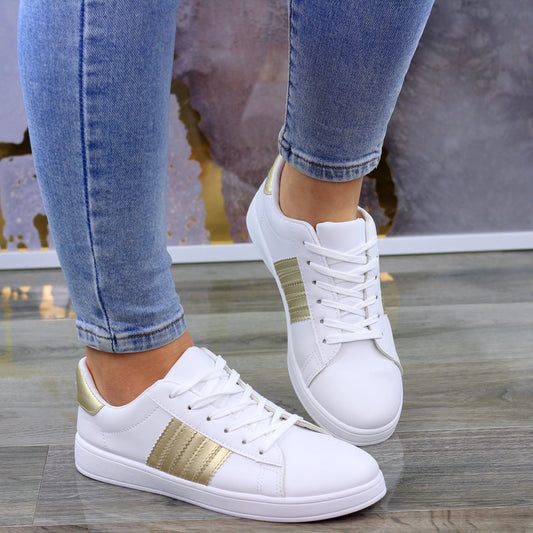 Biało złote Skórzane Tenisówki Trampki Damskie z paskami Signum