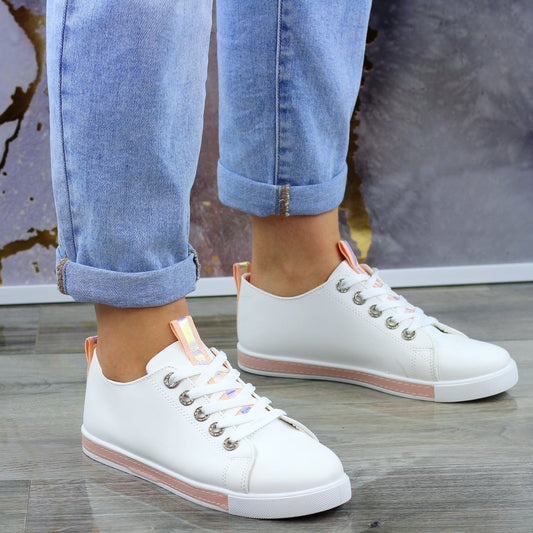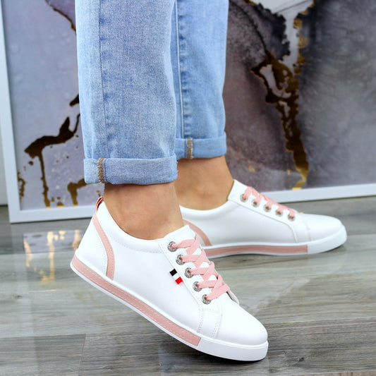 MODNE BIAŁO RÓŻOWE SKÓRZANE TRAMPKI DAMSKIE SZNUROWANE PRETTY