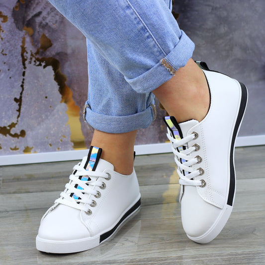 BIAŁE SKÓRZANE GŁADKIE TRAMPKI DAMSKIE efekt holo
