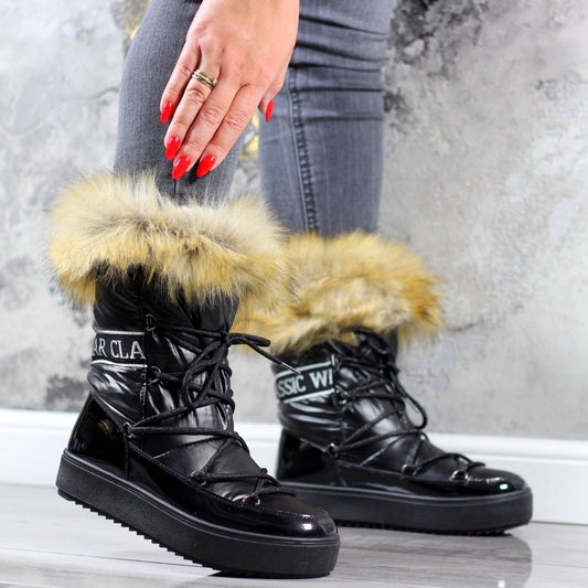 Czarne buty śniegowce eskimoski damskie z futrem Fluo