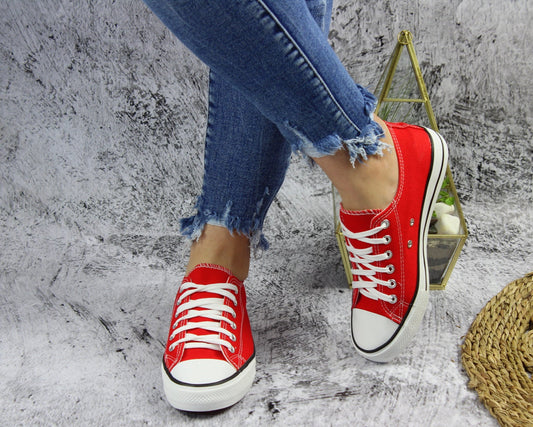 Czerwone sznurowane gładkie trampki damskie