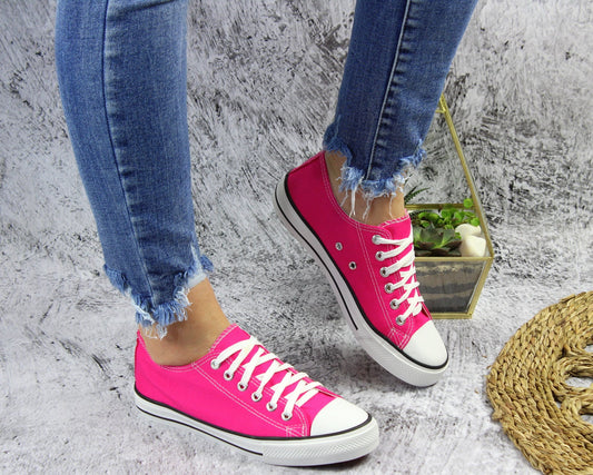 Różowe sznurowane gładkie trampki damskie