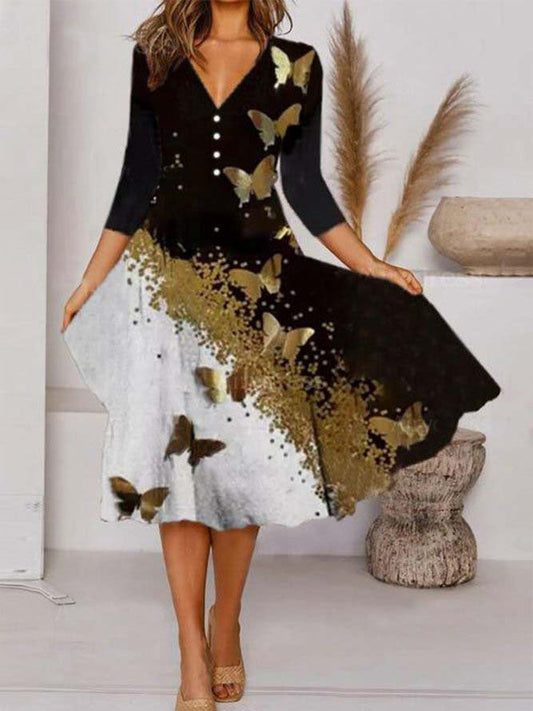 Drukowana sukienka V-neck z siedmioczęściowym rękawem
