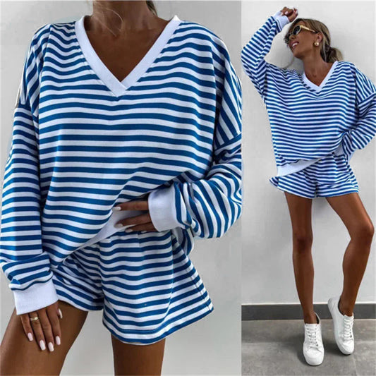 Дамско облекло от две части V-образно деколте на райета Свободен топ и шорти