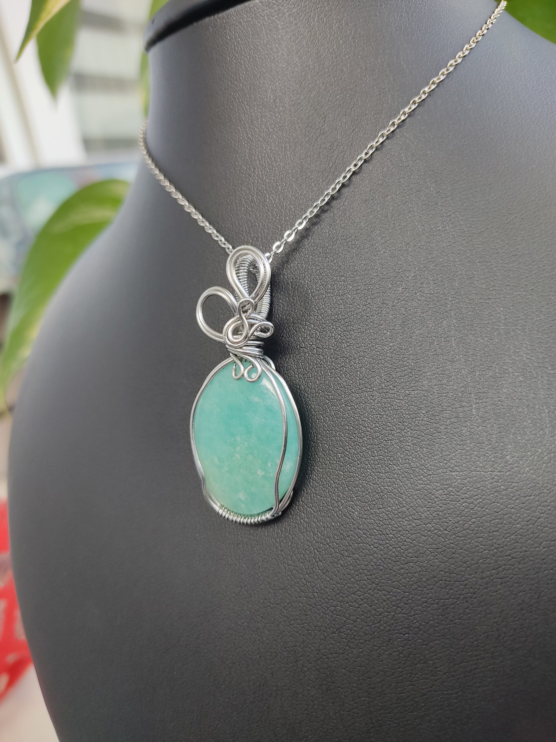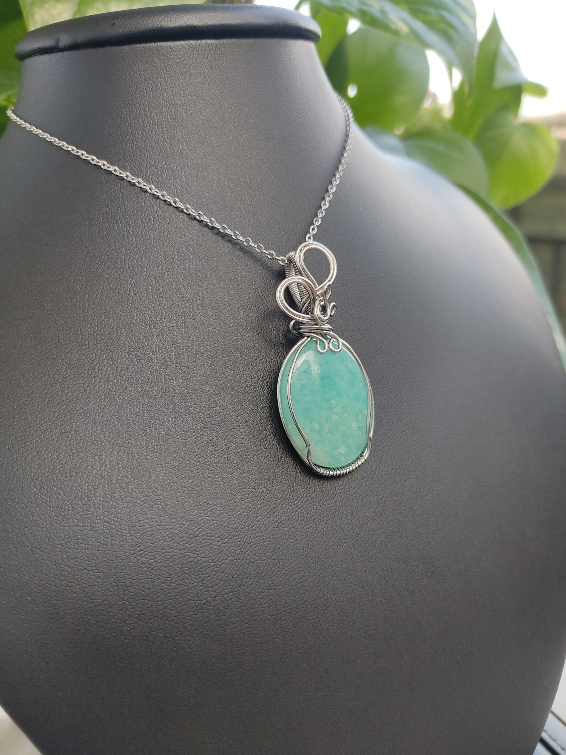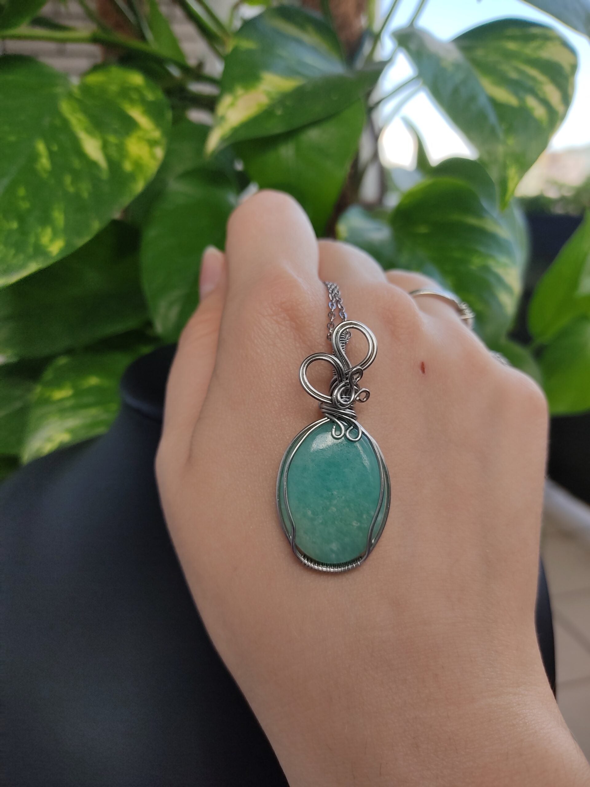 Ręcznie robiony wisiorek z amazonitem. Wykonany techniką wire wrapping z drutów ze stali chirurgicznej.