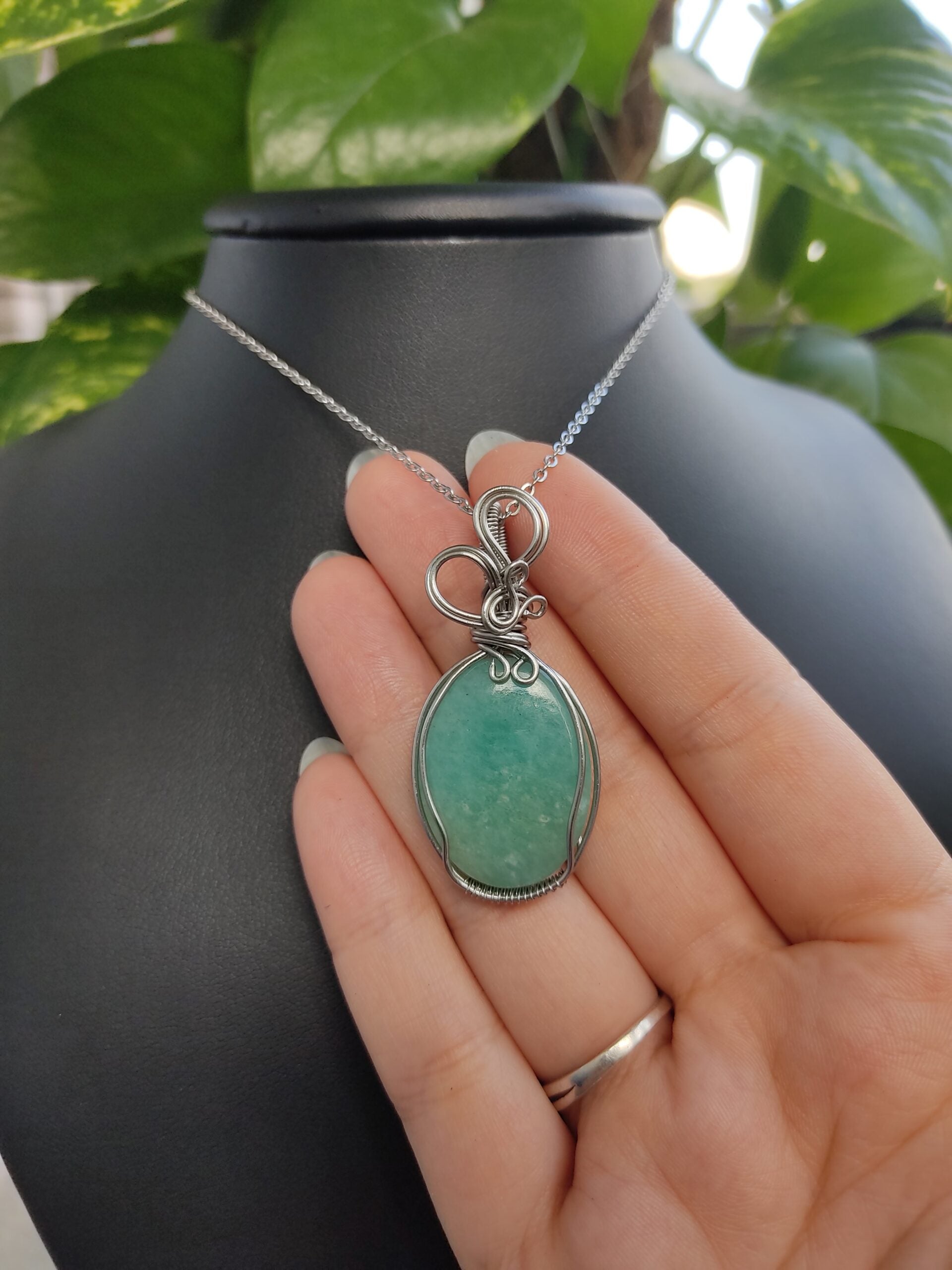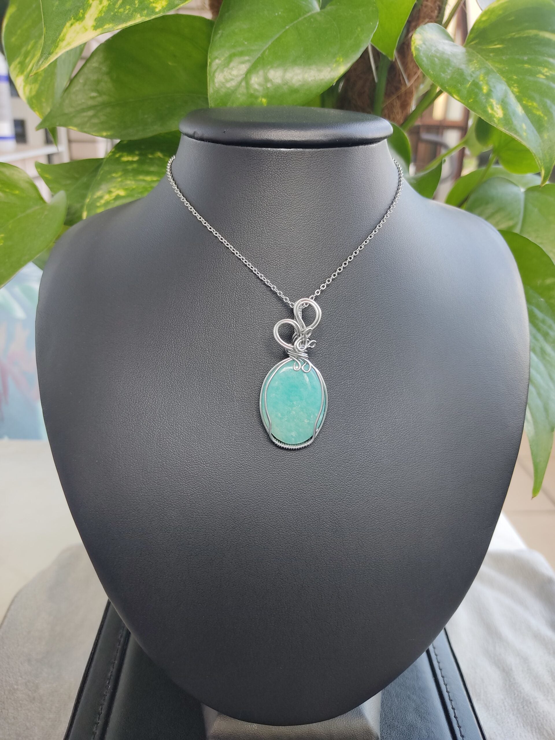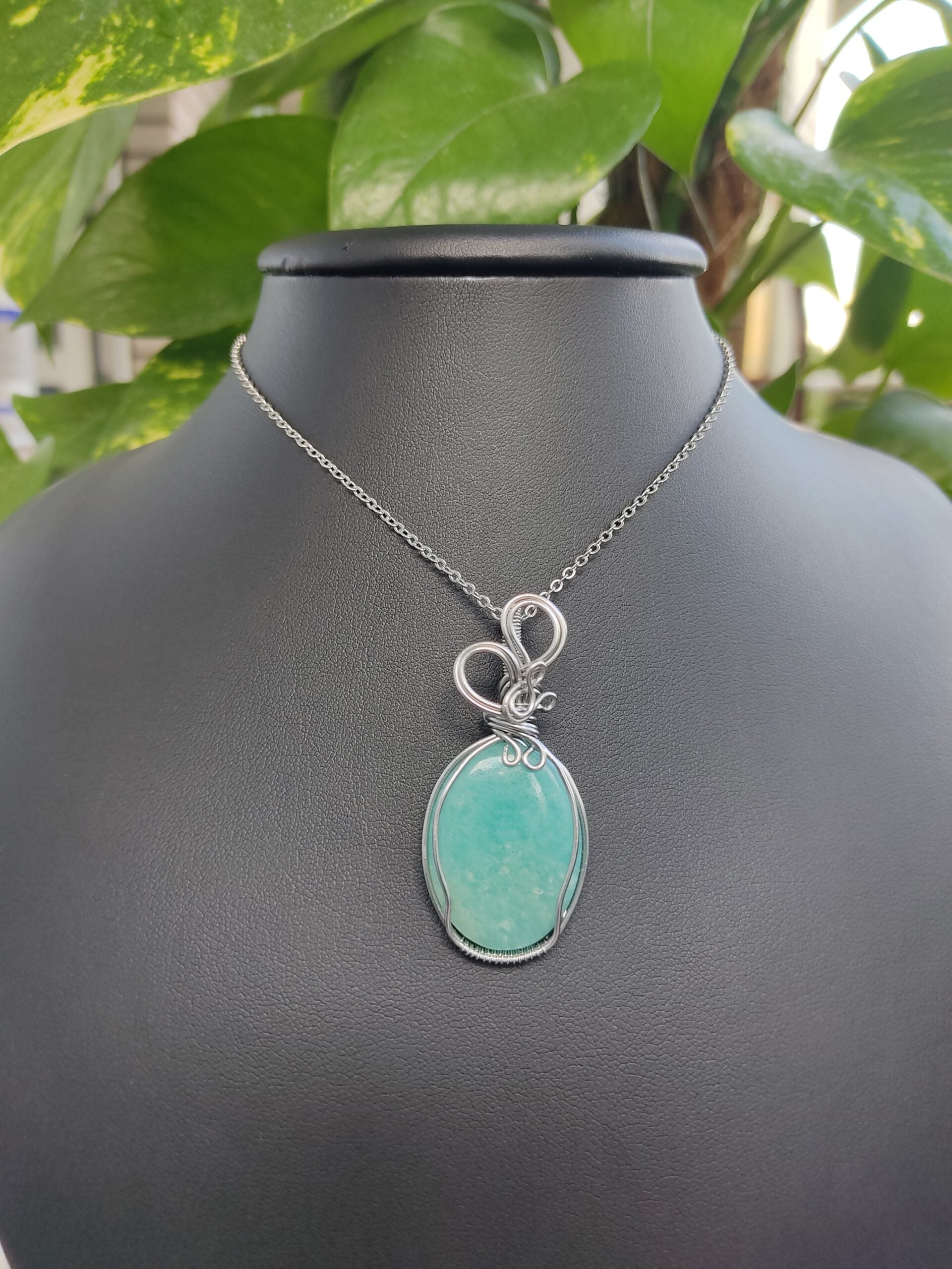 Ręcznie robiony wisiorek z amazonitem. Wykonany techniką wire wrapping z drutów ze stali chirurgicznej.