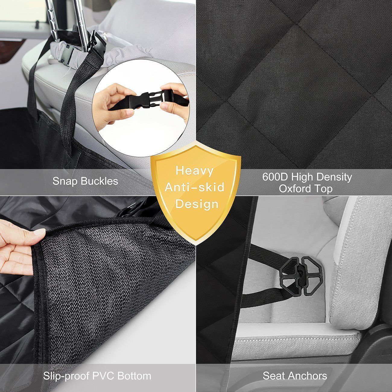 Wasserdicht und rutschfester Träger-- Das 600D Oxford-Gewebe und PVC-Material halten den Rücksitz trocken und sauber. Die Anti-Rutsch-Gummi-Unterlage macht den Deckel an Ort und Stelle, um die Sicherheit auf Ihren schönen Haustieren zu garantieren, wenn Sie fahren. Die PP-Baumwoll-Schicht ist weich und bequem für Ihren Hund. Und alle 4-Schicht-Konstruktion macht es perfekt für Ihr Auto und Haustier.