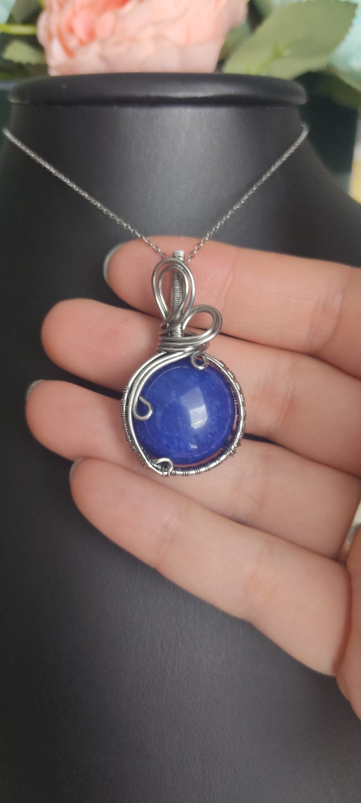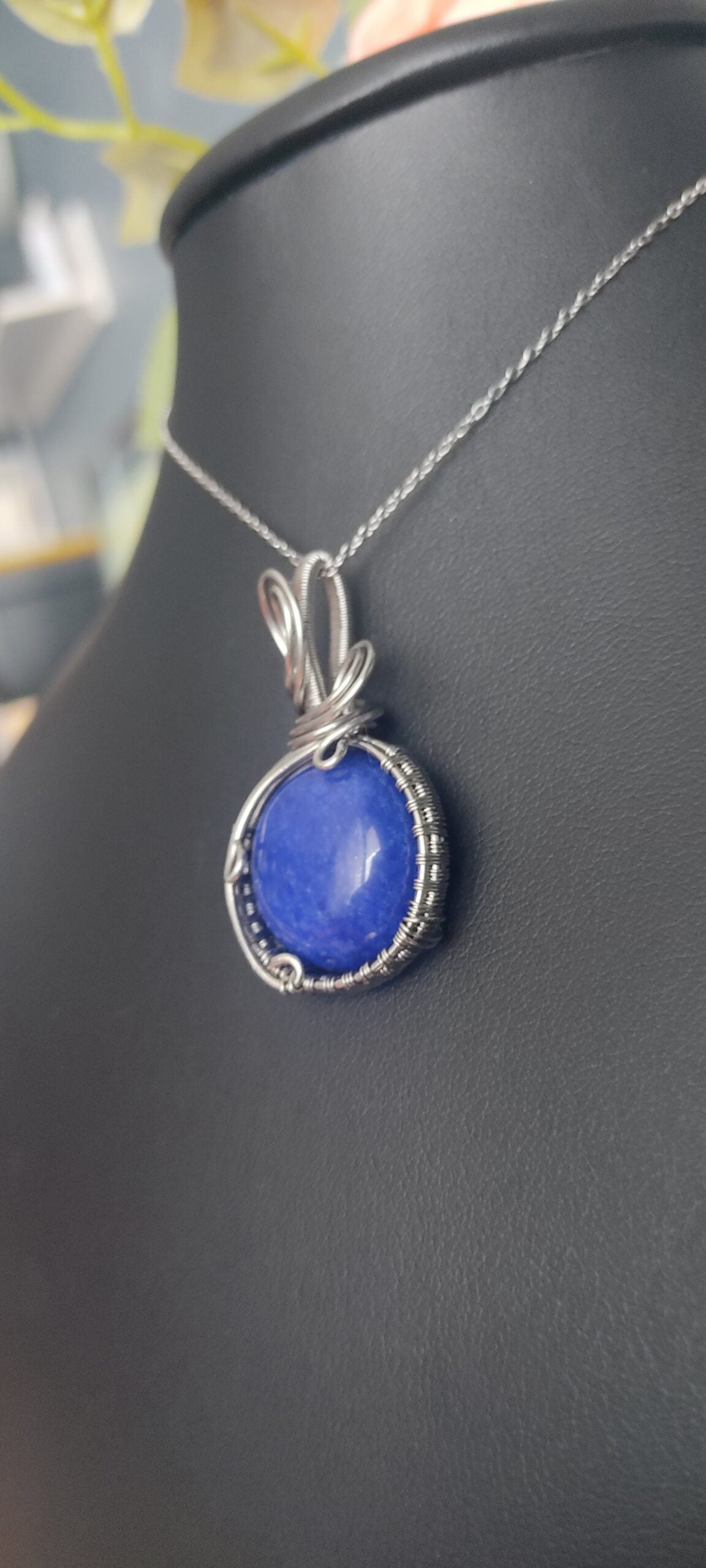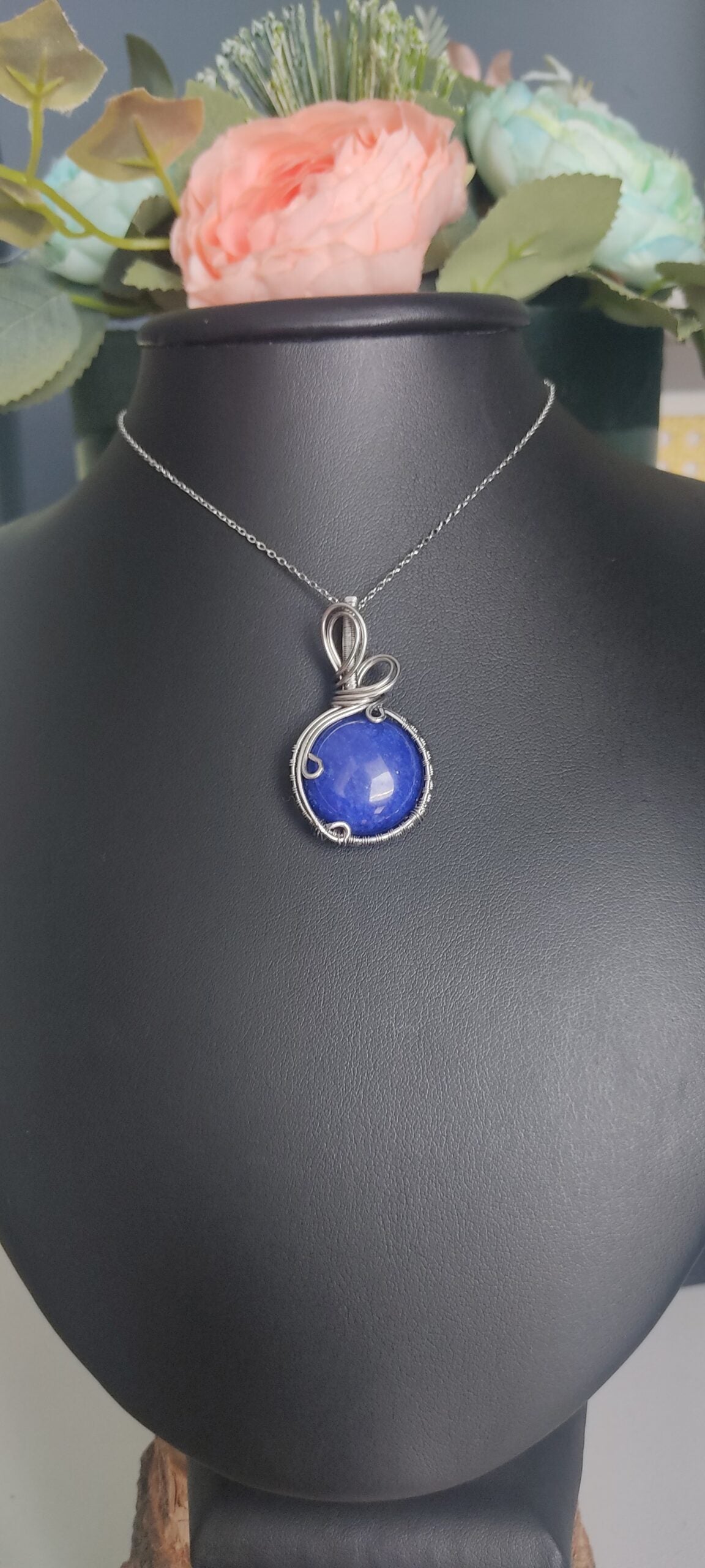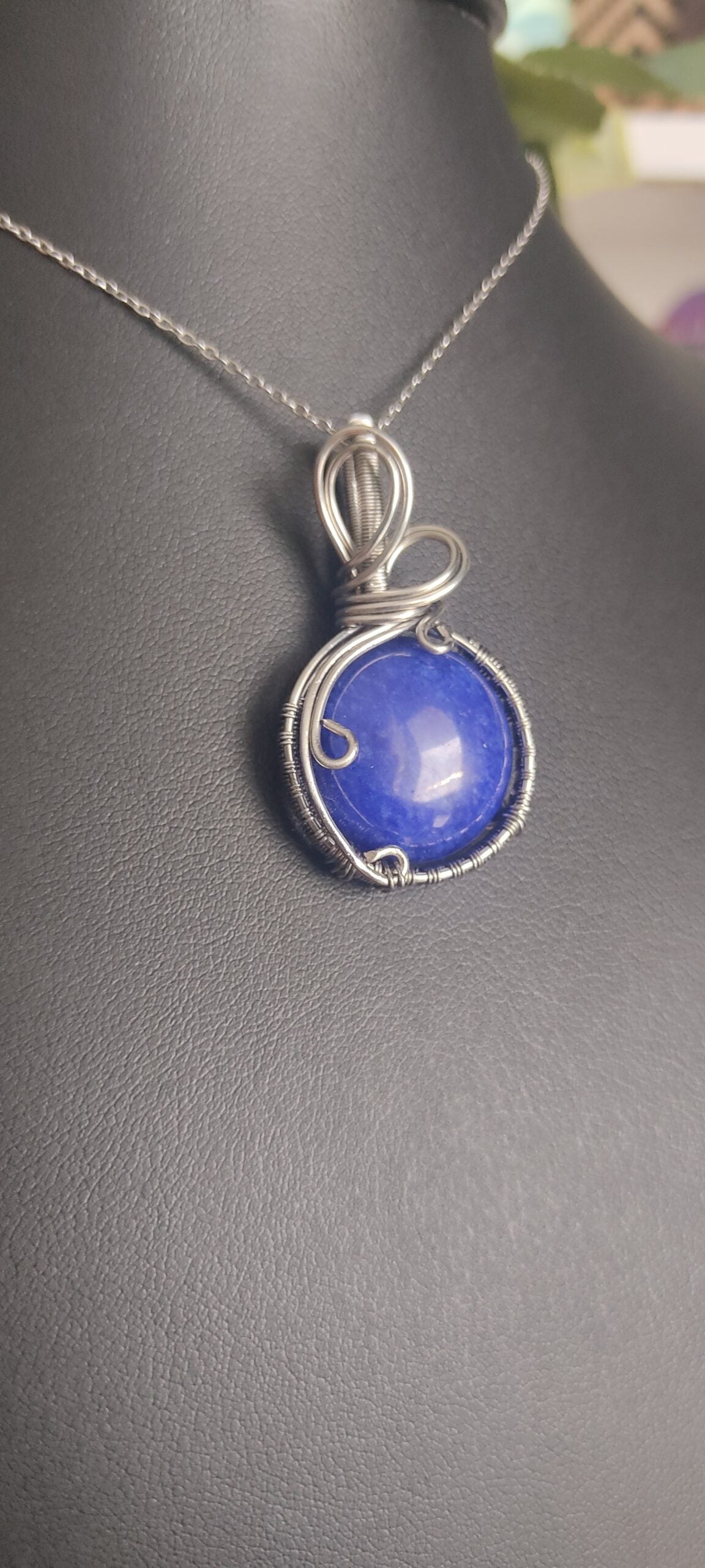 Ręcznie robiony wisiorek z jadeitem. Wykonany techniką wire wrapping z drutów ze stali chirurgicznej.