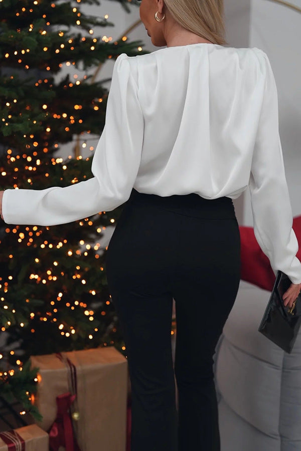Тази сатенена риза с V-образно деколте със сигурност ще бъде хит сред модниците! Изисканата, полирана материя и изрязаните маншети помагат на ризата да прилепне към тялото и създава плисиран ефект, който красиво подчертава талията. Вниманието привлича деколтето, върху което е избродирана елегантна роза. Перфектно съчетана със стилни панталони и поли, ризата добавя блясък към вашето облекло, независимо дали излизате навън или празнувате важно събитие.